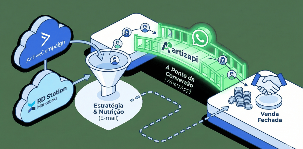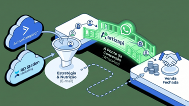O Artizapi não tenta substituir o motor de e-mail marketing da RD ou do AC. Ele foi desenhado para preencher a lacuna do atendimento imediato e organizado no WhatsApp.